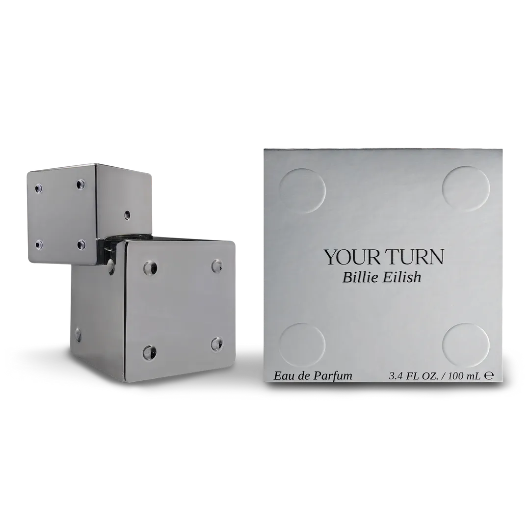BILLIE EILISH YOUR TURN EDP es la tercera fragancia de la línea de perfumes de la artista Billie Eilish, lanzada en 2025. Este perfume unisex combina calidez amaderada con frescura frutal y toques especiados, presentado en un icónico frasco con diseño de dado que simboliza la suerte y la aventura .